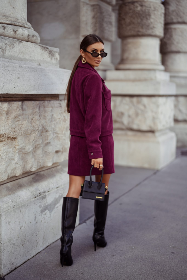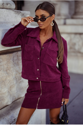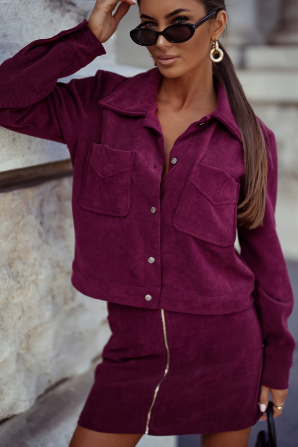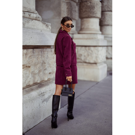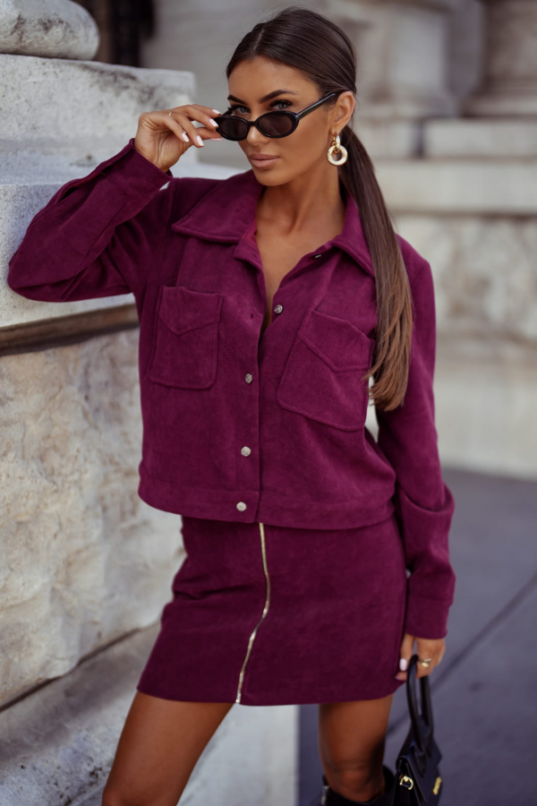 Stylowa spódniczka mini w kolorze burgundowym. Model zapinany jest na ozdobny suwak umieszczony z przodu. Spódniczka posiada klasyczne kieszenie na bokach oraz ozdobne patki z tyłu. Modna i stylowa propozycja Twojej stylizacji na ten sezon.