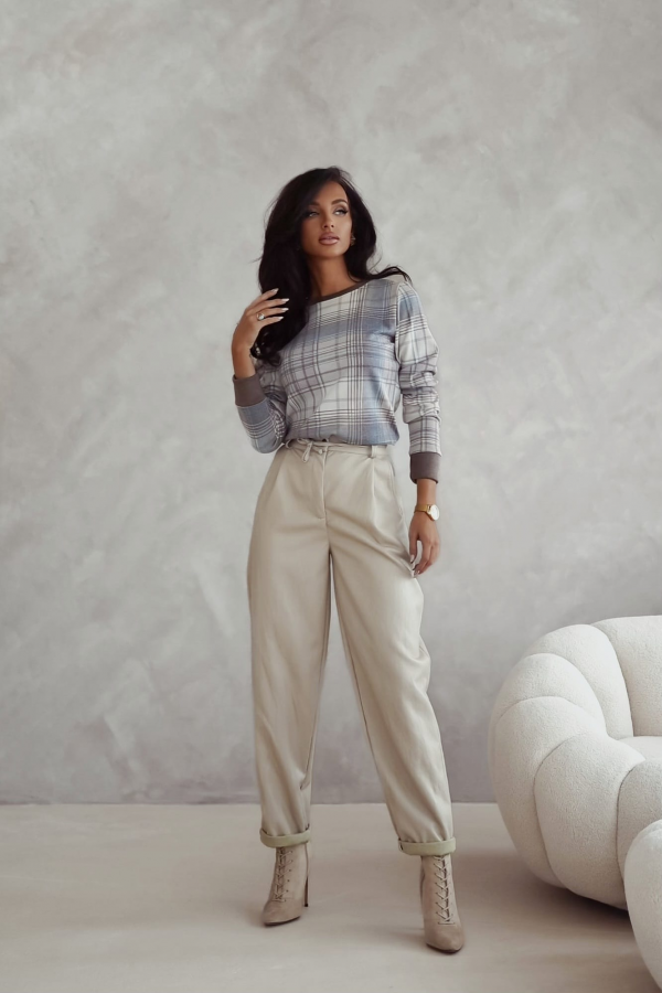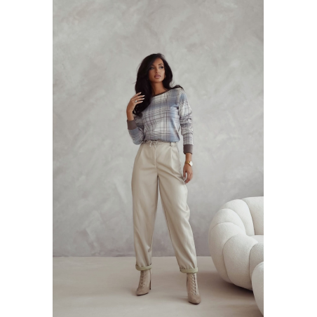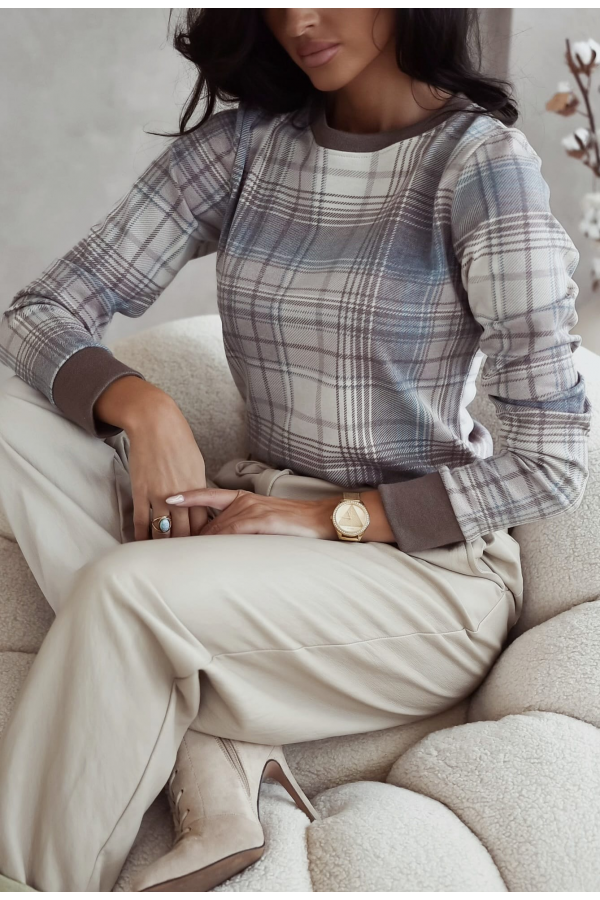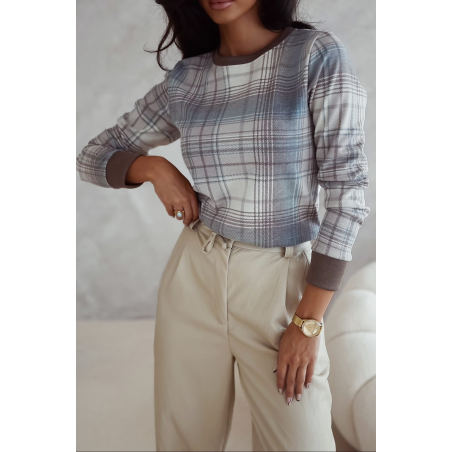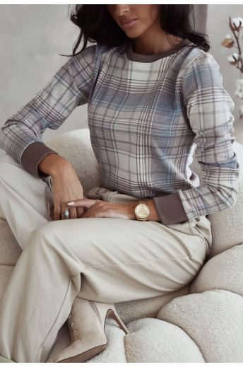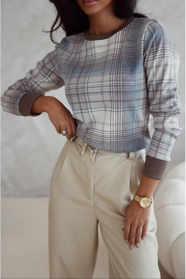 Sweter damski w kratę w odcieniach brązu, beżu oraz błękitu. Model o klasycznym fasonie, posiada ściągacz na rękawie. Sweterek wykonany z przyjemnego materiału. Jest to idealna propozycja Twojej codziennej stylizacji.