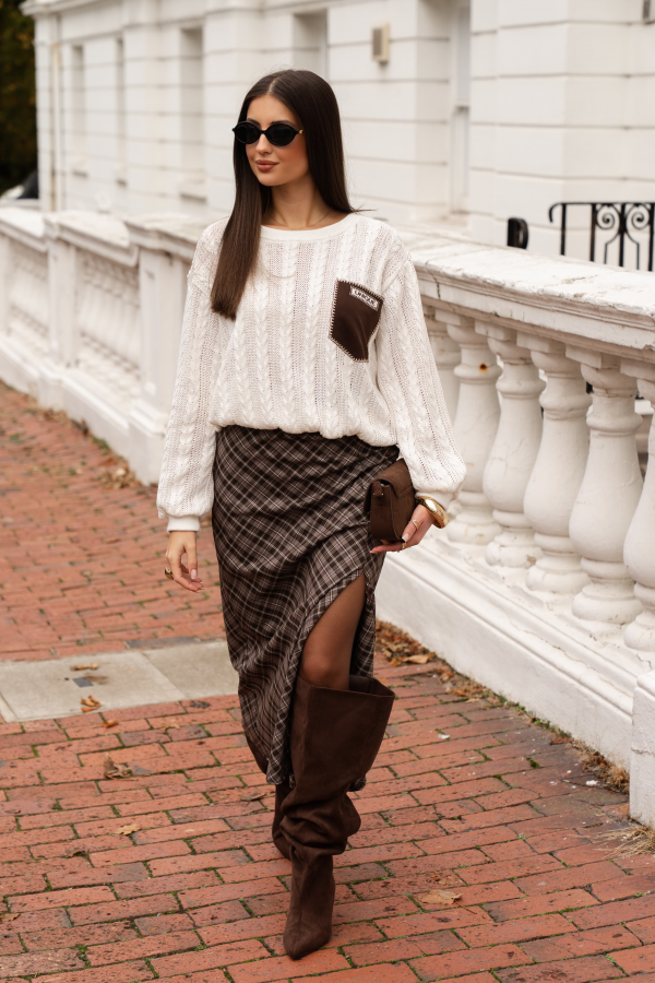SPÓDNICA DŁUGA W KRATĘ, BRĄZOWA.
