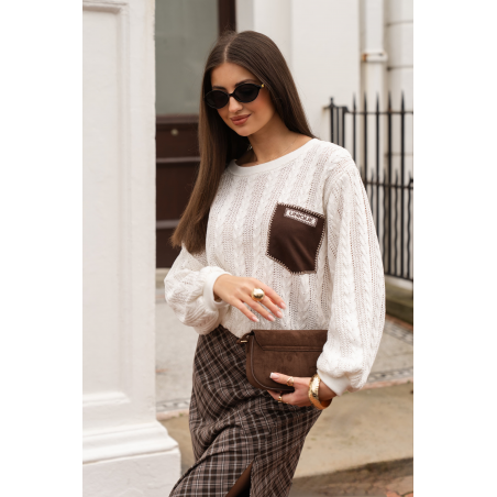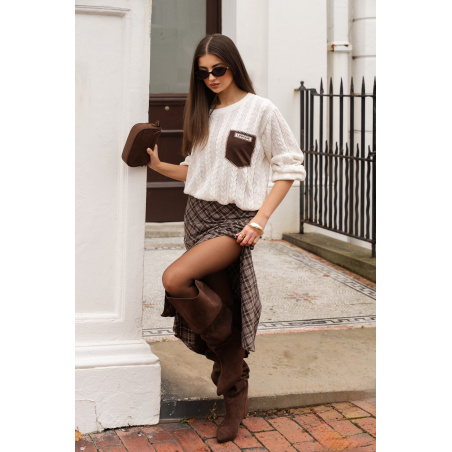 Stylowa spódnica maxi w kratę w kolorze brązowym. Model o rozkloszowanym fasonie, posiada rozcięcie z przodu oraz gumkę w pasie. Model świetnie pasuje do stylizacji na sezon jesień/zima.