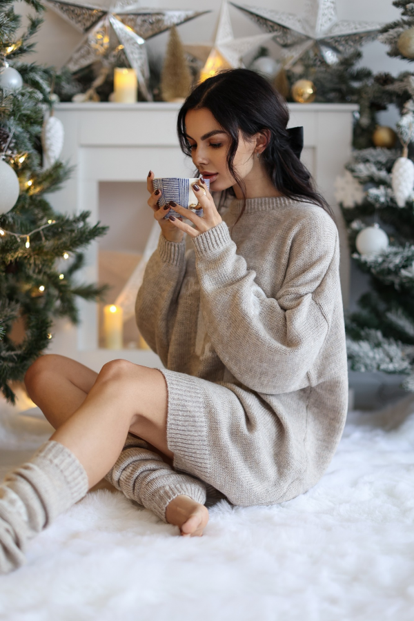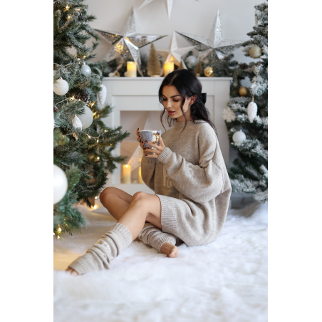 Świąteczny komplet - dzianinowa sukienka oraz ocieplacze na nogi z napisem HOHO w kolorze beżowym. Komplet ten stanowi świetną propozycję Twojej zimowej lub świątecznej stylizacji. Idealnie sprawdzi się także jako gwiazdkowy upominek.