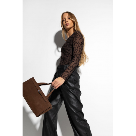 Elegancka, siateczkowa bluzka damska w kolorze brązowym z motywem w róże. Model z długimi rękawami, posiada podszewkę z przodu. Bluzka wykonana z bardzo przyjemnego materiału. Świetna propozycja na na ten sezon.