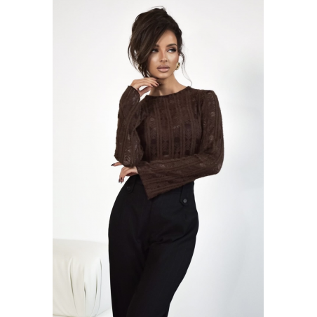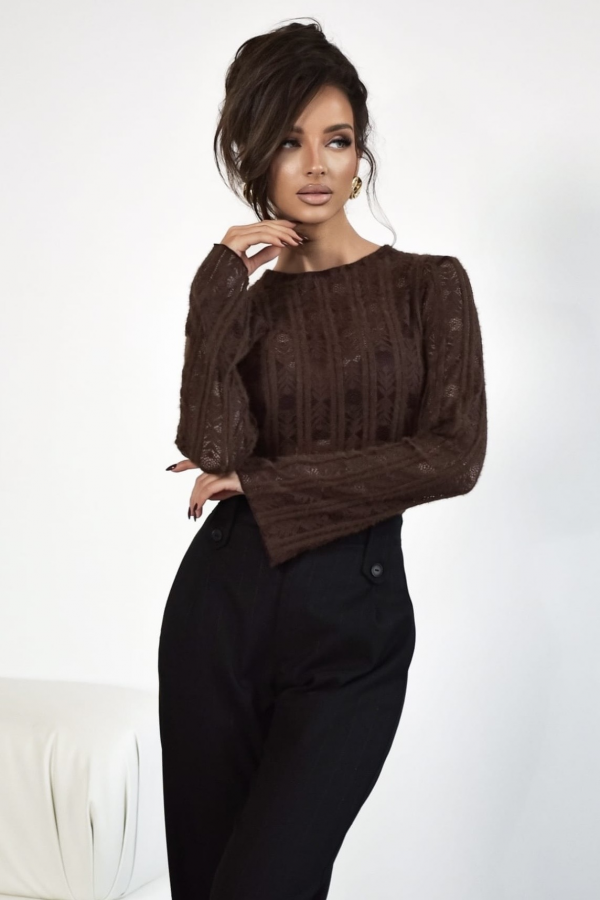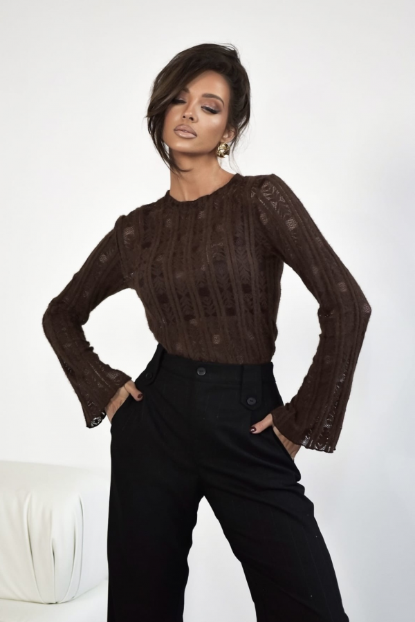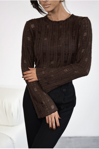 Sweterek damski w kolorze brązowym. Model posiada lekko rozkloszowany rękaw. Sweterek wykonany z przyjemnej, elastycznej dzianiny koronkowej. Jest to idealna propozycja Twojej codziennej stylizacji.