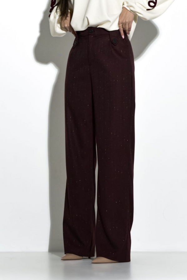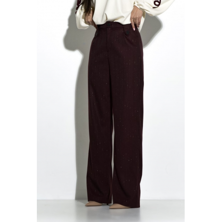 Spodnie damskie o szerokim kroju w pięknym śliwkowym kolorze. Wzór w drobną jodełkę z delikatnymi akcentami ze złotej nitki. Spodnie posiadają ściągacz oraz klasyczne zapięcie w pasie. Model posiada szersze nogawki oraz klasyczne kieszenie. Jest to świetny model odpowiadający najnowszym trendom w modzie. Idealna propozycja zarówno do codziennych jak i eleganckich stylizacji.