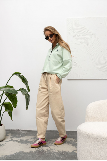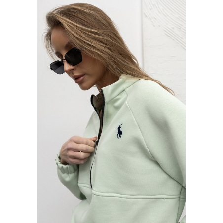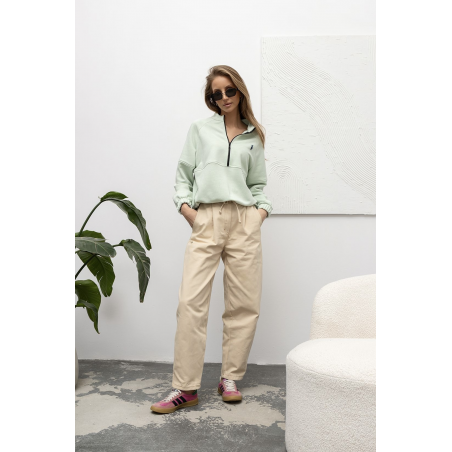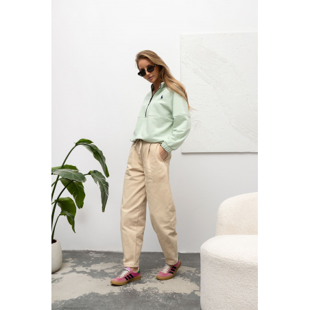 Bluza bawełniana w pięknym kolorze matcha. Bluza wykonana z przyjemnego, cienkiego materiału. Model ten jest zapinany na zamek do połowy długości, posiada kołnierzyk typu stójka oraz ozdobne przeszycia w talii i na rękawach. Dół bluzy i rękawy wykończone ściągaczem. Świetna propozycja Twojej codziennej stylizacji.