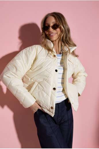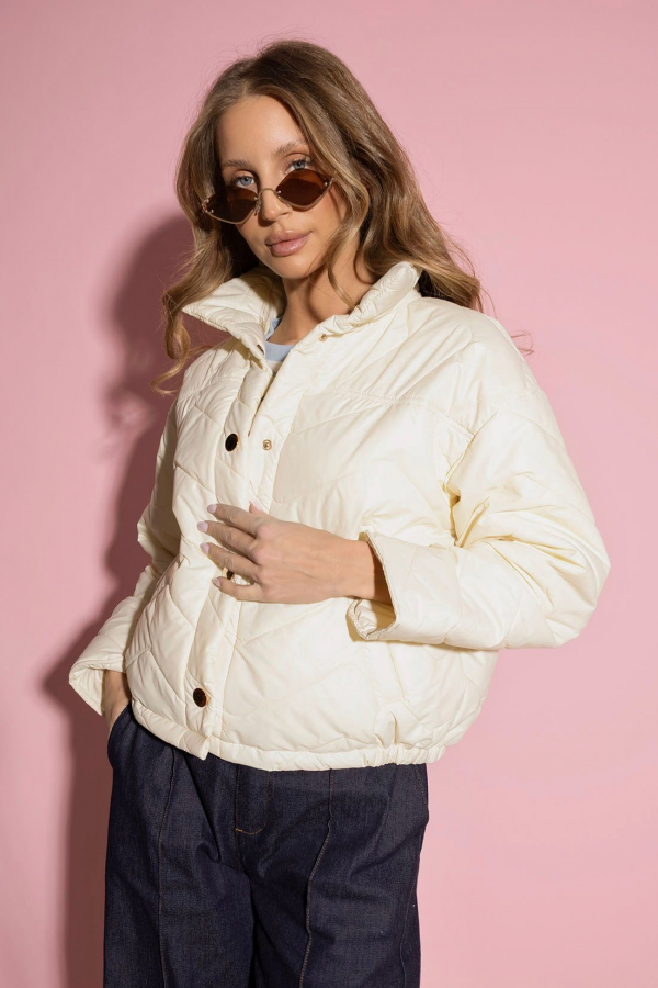 Krótka, pikowana kurtka w kolorze kremowym. Model jest zapinany na guziczki, posiada wysoki kołnierz oraz klasyczne kieszonki. Od wewnątrz kurtka jest wykończona jasną, jednolitą podszewką. Kurtka posiada delikatny ściągacz w pasie oraz ozdobne rozcięcia na końcu rękawów. Nowoczesny design oraz modne pikowanie podkreśli Twój styl w tym sezonie.