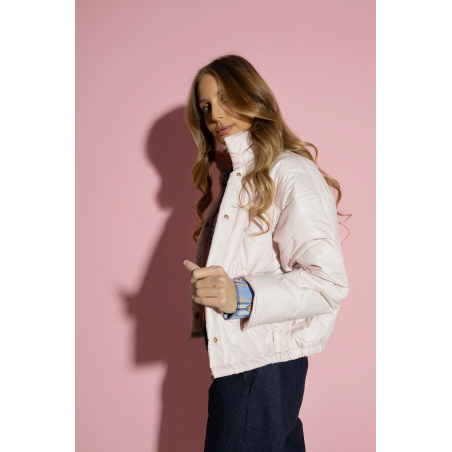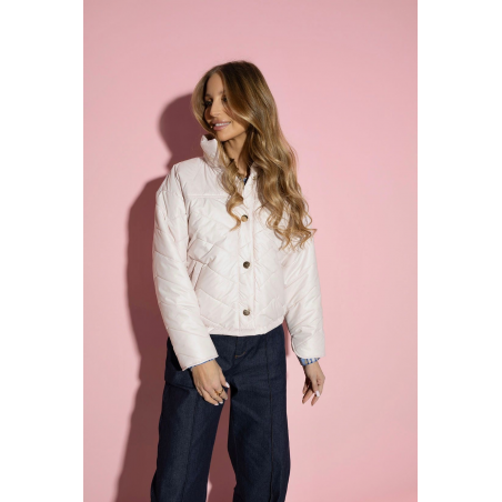 Krótka, pikowana kurtka w kolorze pudrowo różowym. Model jest zapinany na guziczki, posiada wysoki kołnierz oraz klasyczne kieszonki. Od wewnątrz kurtka jest wykończona jasną, jednolitą podszewką. Kurtka posiada delikatny ściągacz w pasie oraz ozdobne rozcięcia na końcu rękawów. Nowoczesny design oraz modne pikowanie podkreśli Twój styl w tym sezonie.