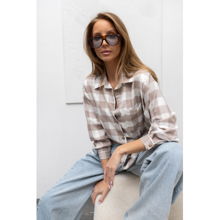 Koszula damska o krótszym kroju w kratkę, w odcieniach beżu. Bluzka wykonana jest z przyjemnego materiału. Model zapinany na guziki, posiada długi rękaw oraz klasyczny kołnierzyk. Koszula wykończona ozdobnym wiązaniem u dołu. Jest to idealna propozycja uzupełniająca Twoją codzienną stylizację.