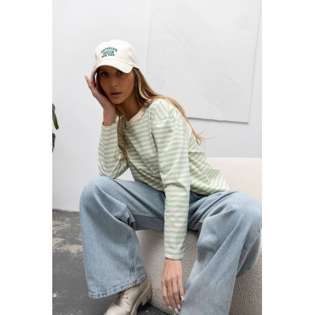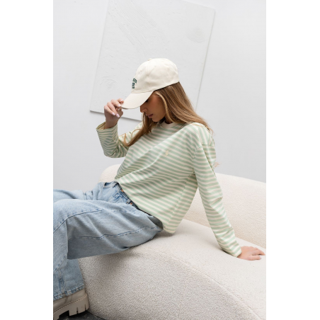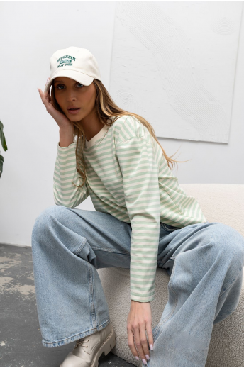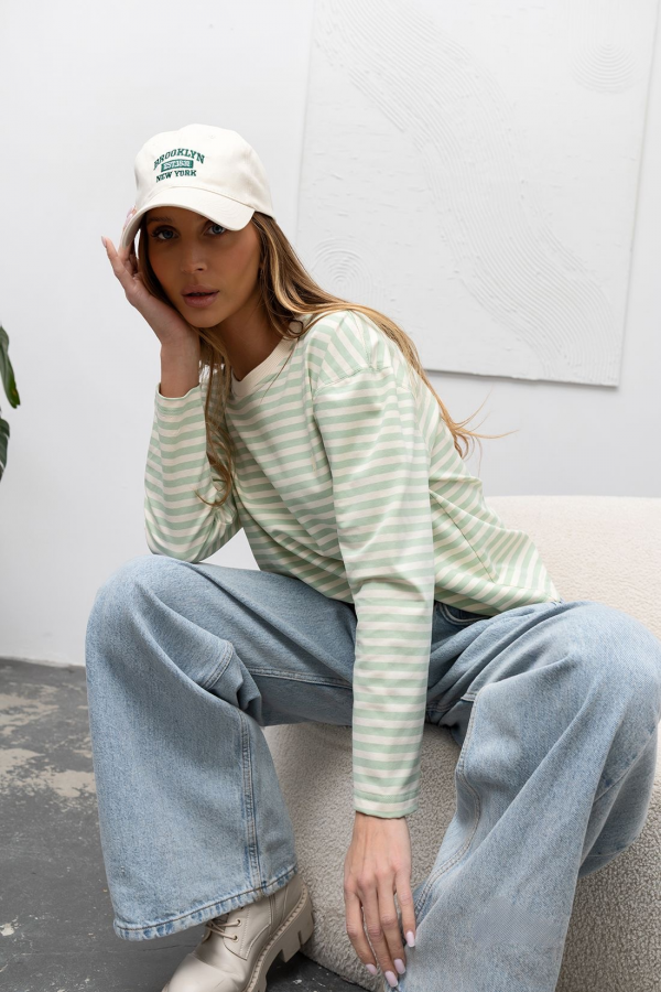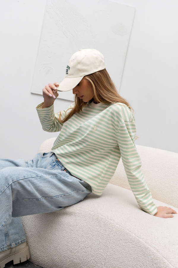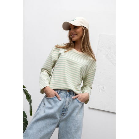 Longsleeve damski w kolorze pastelowej zieleni w delikatne paseczki. Model o klasycznym fasonie. Bluzka wykonana jest z bardzo przyjemnego materiału. Jest to idealna propozycja uzupełniająca Twoją codzienną stylizację.