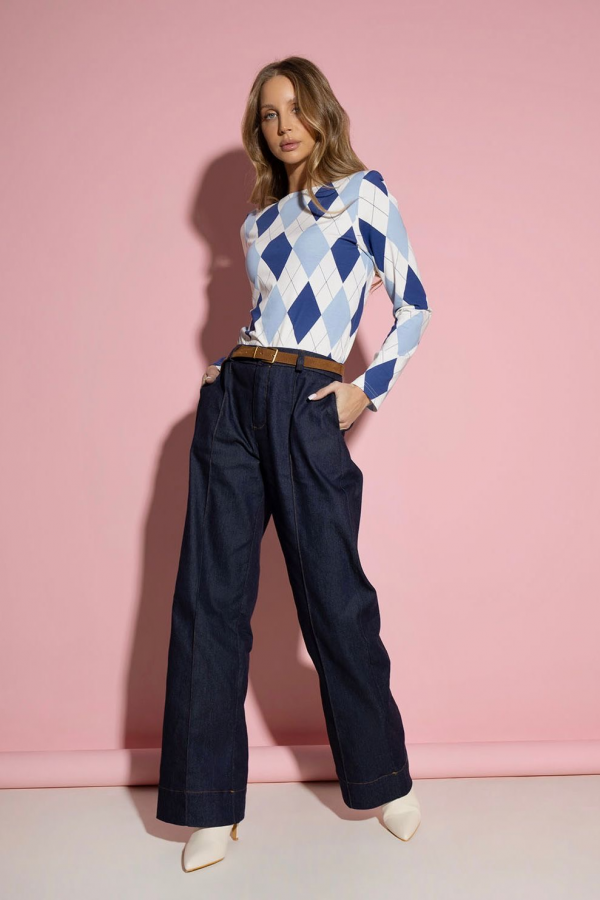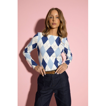 Bluzka damska z długimi rękawami. Bluzka ma wzór w szkockie romby w niebieskiej tonacji. Model posiada klasyczny fason oraz stylowe poduszki na ramionach. Bluzka wykonana jest z bardzo przyjemnego, elastycznego materiału. Idealna propozycja na nadchodzący sezon.