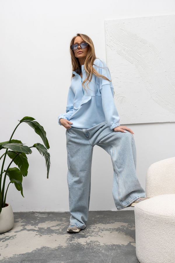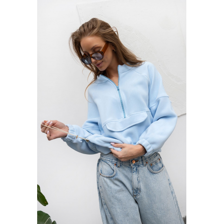 Bluza polarowa w niebieskim kolorze. Bluza wykonana z przyjemnego, ciepłego materiału. Model ten jest zapinany na zamek do połowy długości, posiada kołnierzyk typu stójka oraz ozdobne przeszycia w talii i na rękawach. Przód bluzy wykończony ozdobną patką imitującą kieszonkę. Rękawy wykończone ściągaczem, dół bluzy posiada ściągacz z regulacją. Świetna propozycja Twojej codziennej stylizacji.