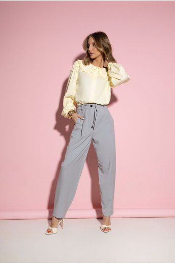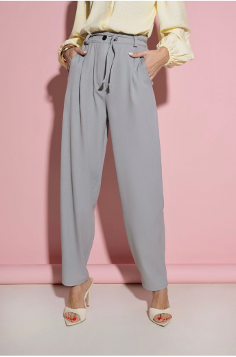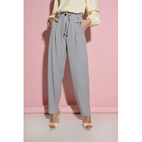 Spodnie damskie o szerokim kroju w kolorze szarym. Spodnie posiadają elastyczną gumkę w pasie, zapięcie na guzik oraz ozdobne wiązanie. Spodnie posiadają szersze nogawki oraz klasyczne kieszenie. Jest to świetny model odpowiadający najnowszym trendom w modzie. Idealnie sprawdzi się casualowych stylizacjach.