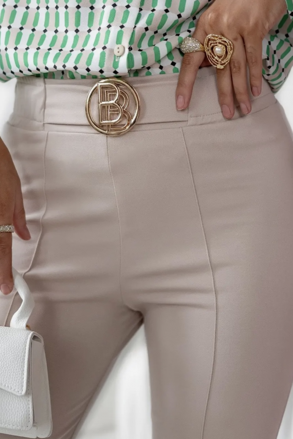 Klasyczne damskie spodnie w kolorze beżowym. Model z gumką w pasie posiada ozdobną klamrę w złotym wykończeniu. Ponadczasowy, klasyczny fason idealnie pasuje zarówno do codziennych jak i eleganckich stylizacji. Spodnie posiadają nogawki w kant, klasyczne kieszenie. Model jest wykonany z elastycznego materiału co zapewnia wygodę podczas noszenia.