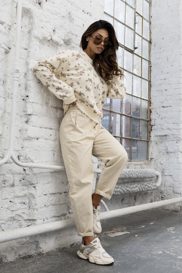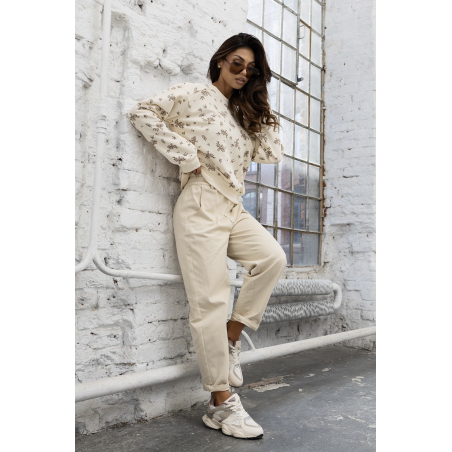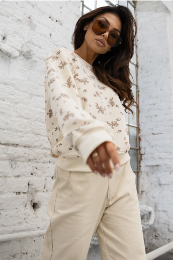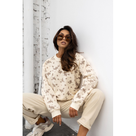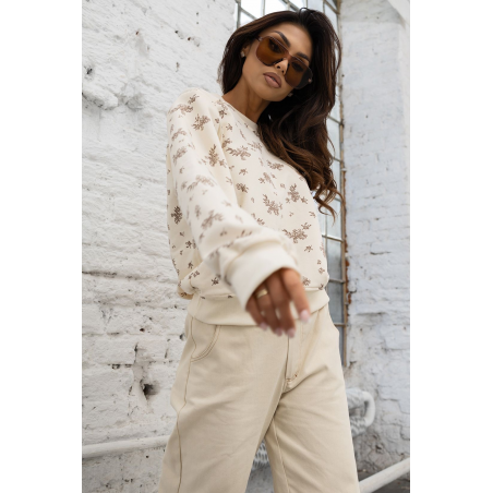 Bluza o klasycznym kroju z wysokiej jakości materiału. Bluza w pastelowych odcieniach beżu oraz brązu z motywem kwiatowym. Dół bluzy i rękawy wykończone ściągaczem, model posiada komfortowe poduszki na ramionach. Świetna baza Twojej codziennej stylizacji.
