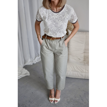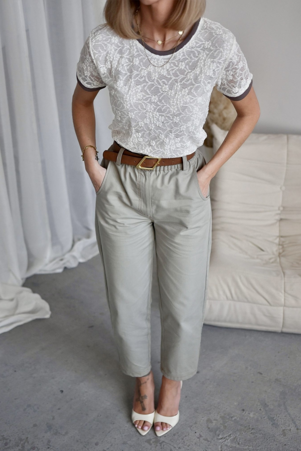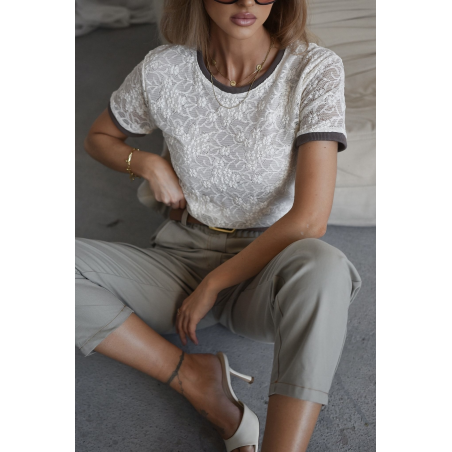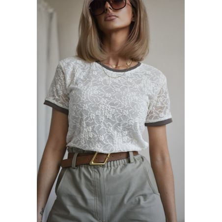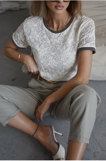 T-shirt damski koronkowy w pięknym kolorze ecru. Model posiada klasyczny fason, krótki rękaw oraz wykończenie rękawów i dekoltu w kolorze brązowym. Bluzka posiada halkę w przedniej części. Idealna propozycja na nadchodzący sezon.