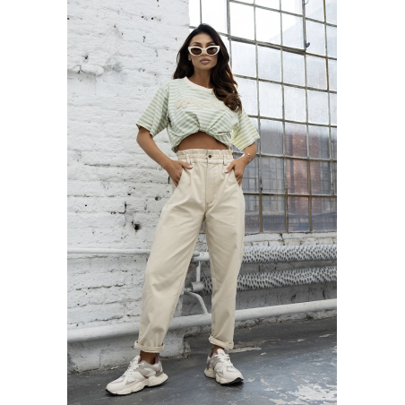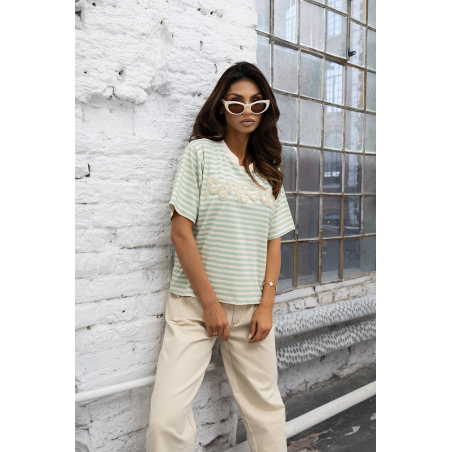 T-shirt damski w pięknym, miętowym kolorze w delikatne paseczki z naszytym jasnym napisem ICONIC CLUB. Model posiada klasyczny fason, krótki rękaw oraz jasne wykończenie dekoltu. Idealna propozycja na nadchodzący sezon.