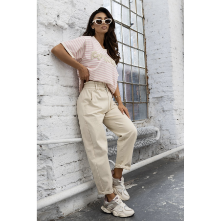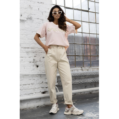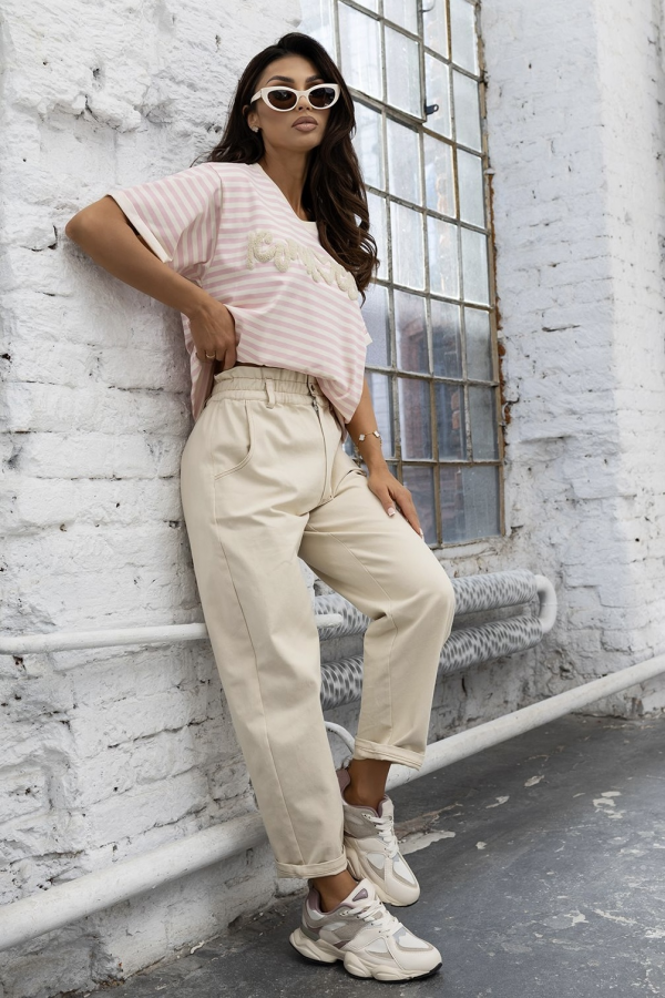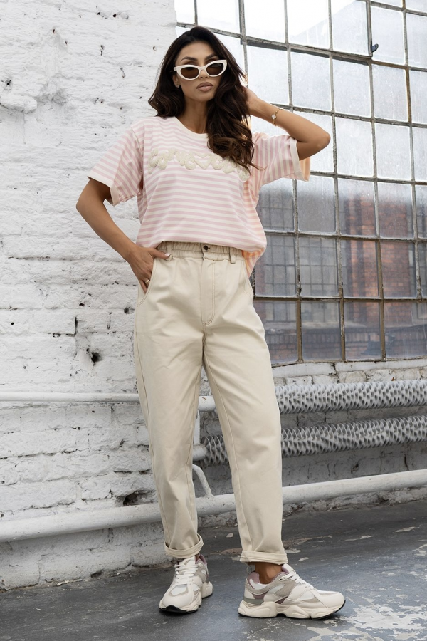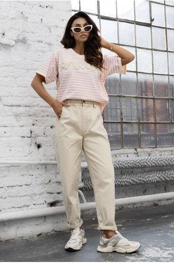 T-shirt damski w pięknym, różowym kolorze w delikatne paseczki z naszytym jasnym napisem ICONIC CLUB. Model posiada klasyczny fason, krótki rękaw oraz jasne wykończenie dekoltu. Idealna propozycja na nadchodzący sezon.