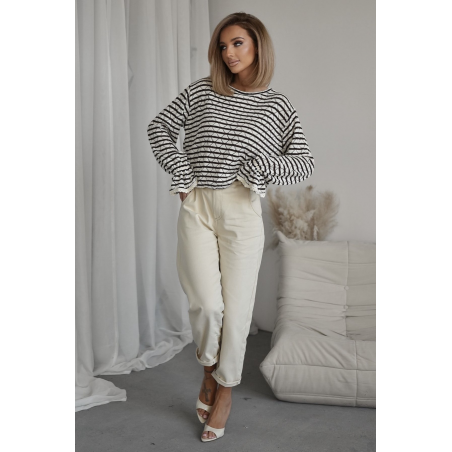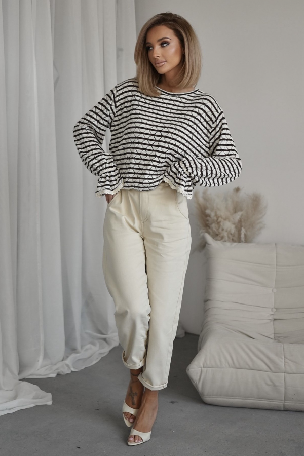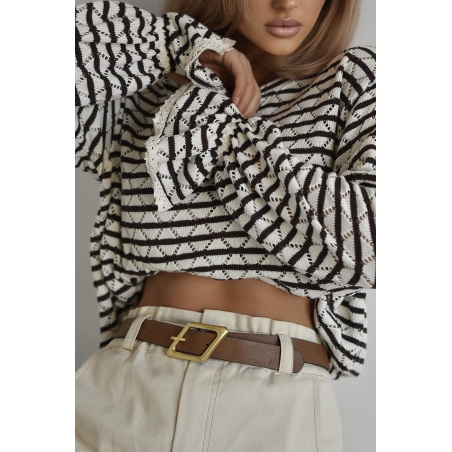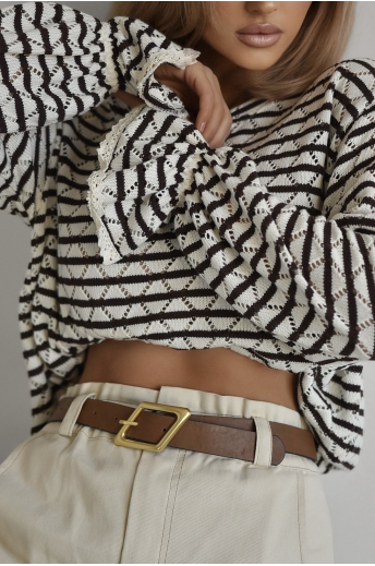 Ażurowy sweter damski w paski o kolorach brązowym oraz białym. Model typu oversize posiada ściągacz w pasie oraz ozdobną falbankę ze ściągaczem na rękawach. Sweterek wykonany z przyjemnego materiału. Jest to idealna propozycja Twojej codziennej stylizacji.