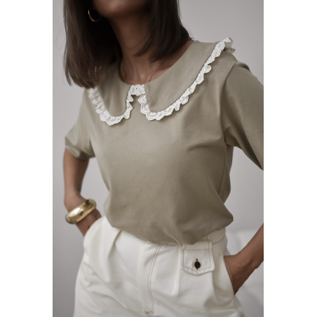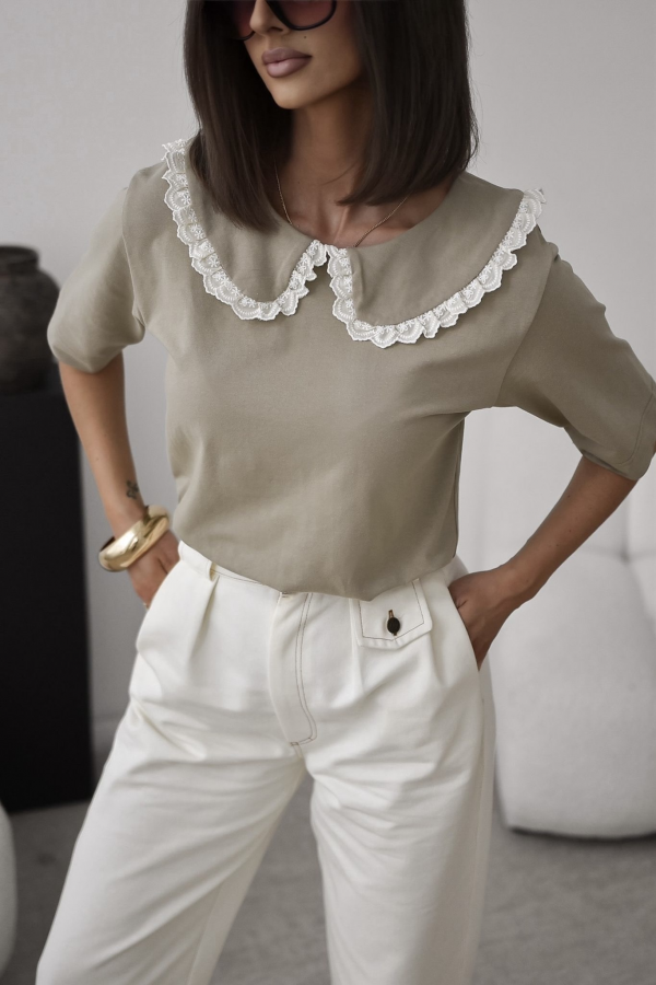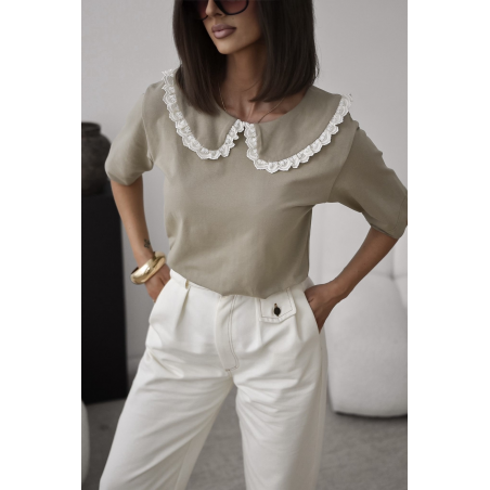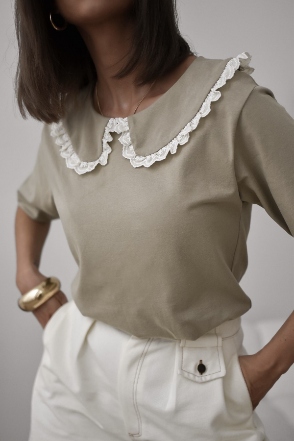 T-shirt damski w pięknym oliwkowym kolorze. Model wykończony ozdobnym kołnierzykiem z koronką na brzegach. Jest to idealna propozycja uzupełniająca Twoją wiosenną stylizację.
