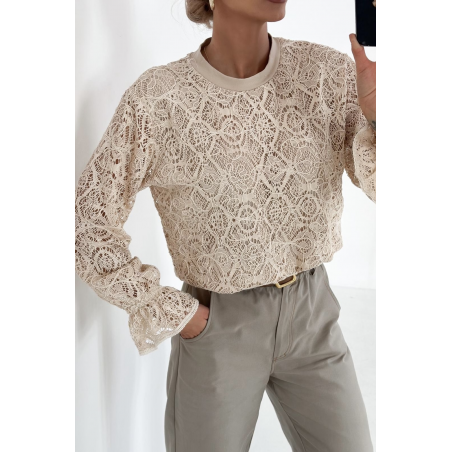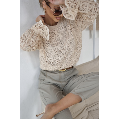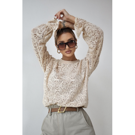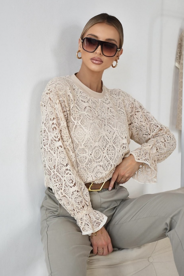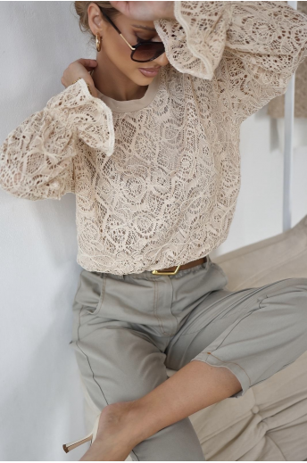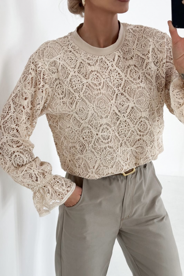 Bluzka damska wykonana z przyjemnej koronki z motywem kwiatowym. Model w kolorze beżowym z długimi rękawami zakończonymi ozdobnym ściągaczem. Bluzka posiada siateczkową podszewkę z przodu oraz ściągacz w pasie. Świetna propozycja, która Cię wyróżni w tym sezonie.