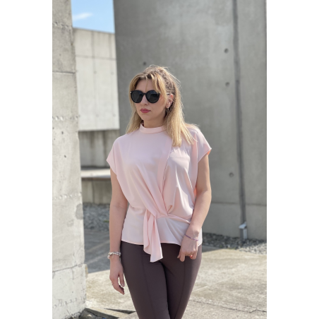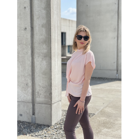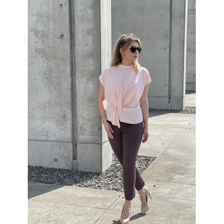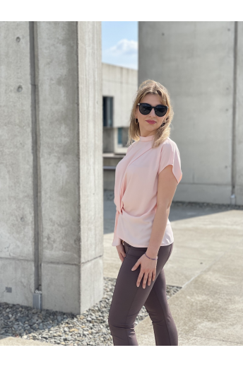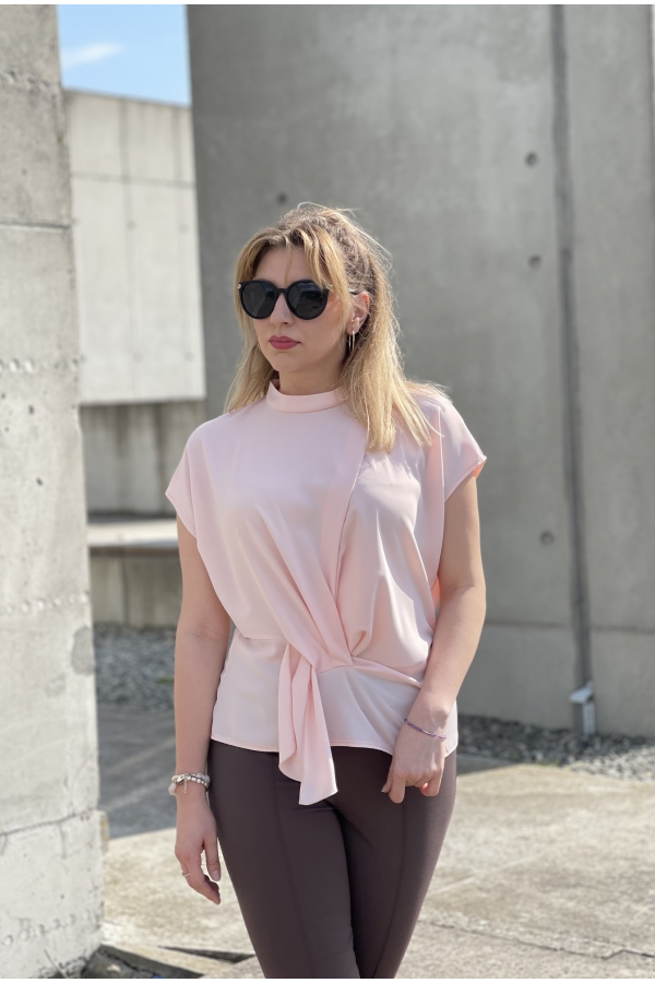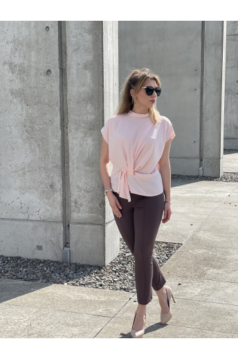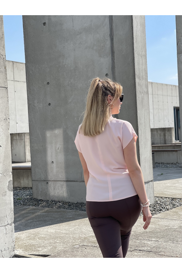 Bluzka damska w kolorze pudrowego różu. Model posiada ozdobne marszczenie w talii oraz zapięcie na jeden guziczek z tyłu. Idealna propozycja uzupełniająca wiosenne stylizacje.