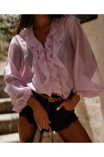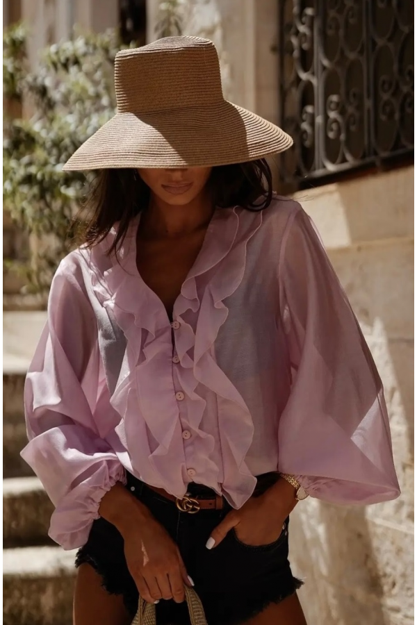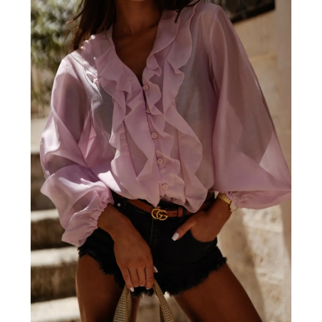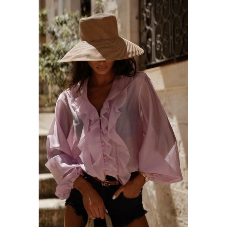 Koszula damska w różowym kolorze zapinana na guziki. Model wykończony ściągaczami na rękawach oraz ozdobną falbaną wokół szyi. Bluzka wykonana jest z bardzo przyjemnego materiału. Jest to idealna propozycja uzupełniająca Twoją letnią stylizację.