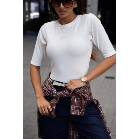 Bluzka damska o krótszym kroju w kolorze ecru. Model posiada klasyczny fason, krótki rękaw oraz napis N5 wykonany z czarnych dżetów. Bluzka wykonana jest z bardzo przyjemnego, elastycznego materiału. Idealna propozycja na nadchodzący sezon.