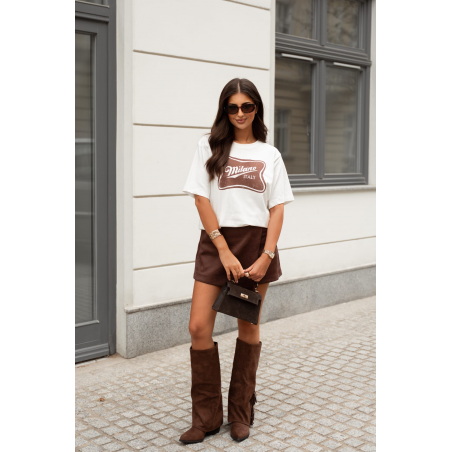 T-shirt damski bawełniany w kolorze białym z brązowym printem na przodzie. Model o luźnym fasonie z krótkim rękawem. T-shirt wykonany jest z wysokiej jakości materiału. Świetna propozycja do codziennych stylizacji.